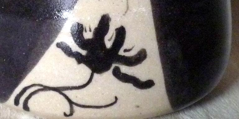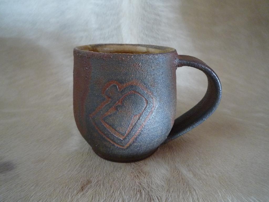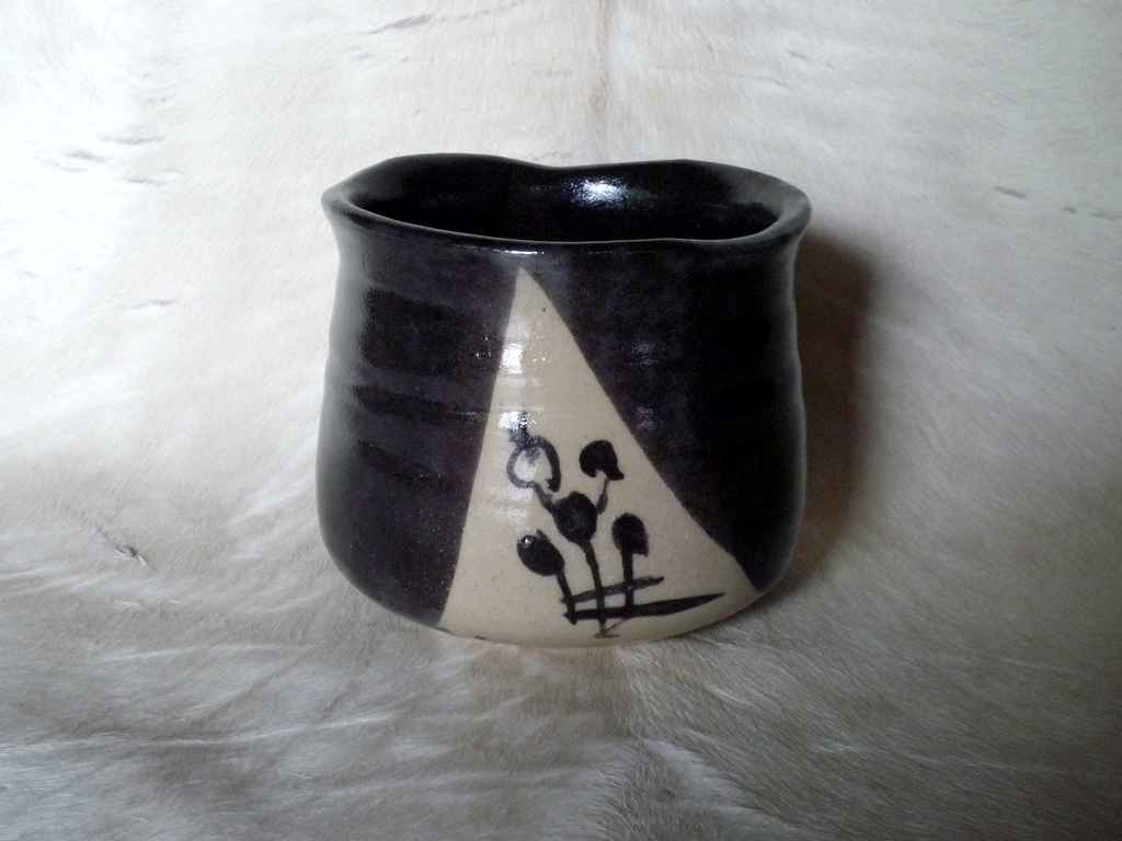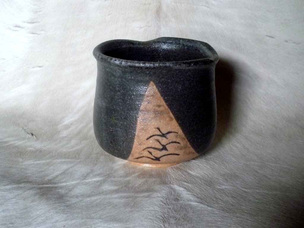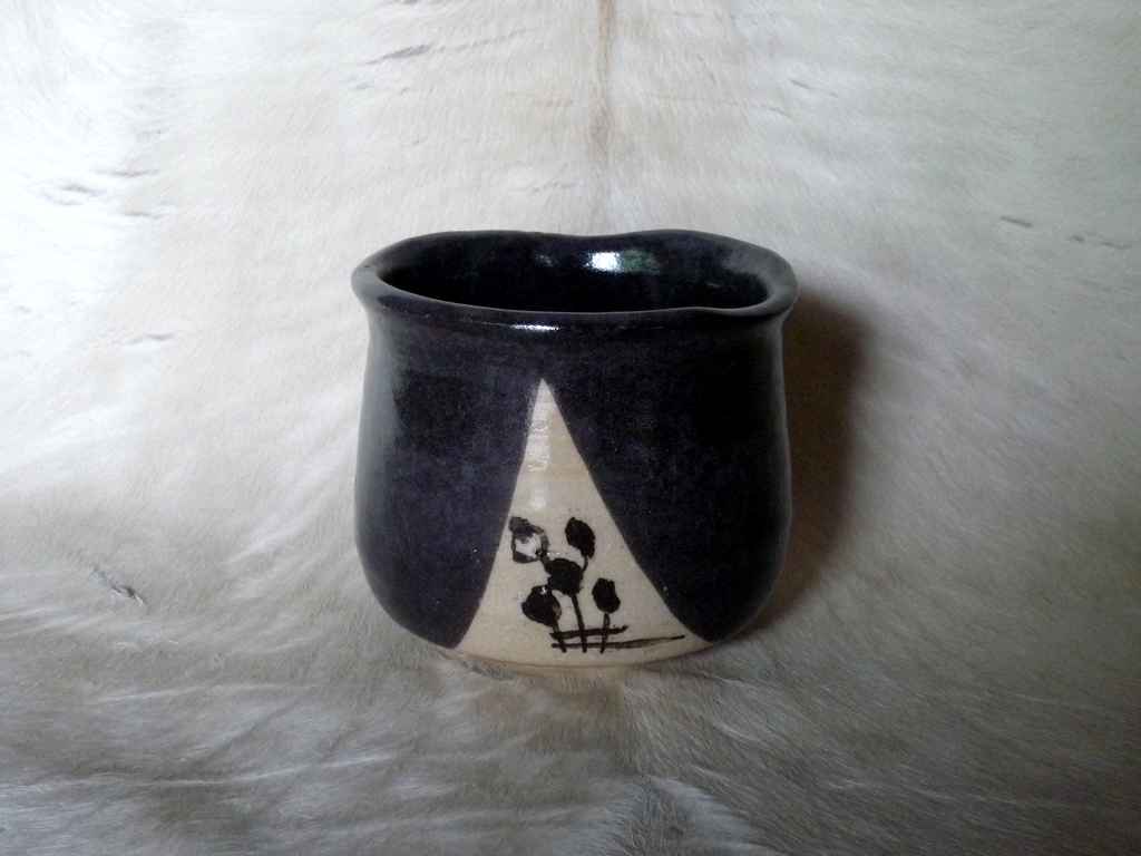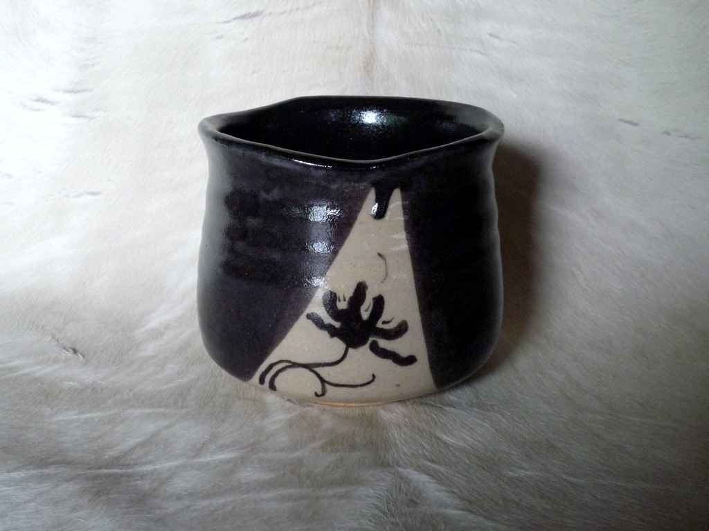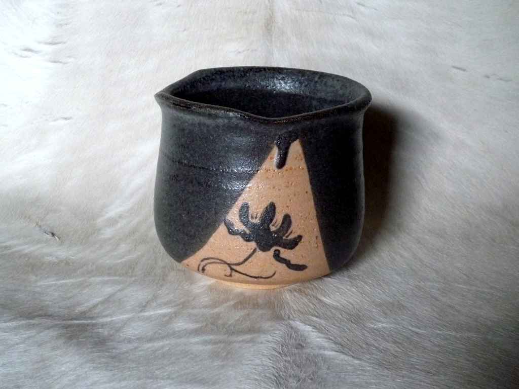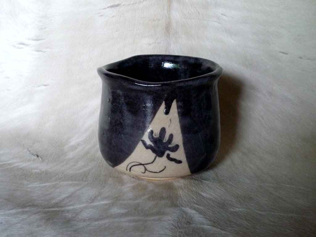 寄居の土を使った化粧を施して、自作の釉薬を。真っ黒にしたかったけど、そこまでには至らなかった。