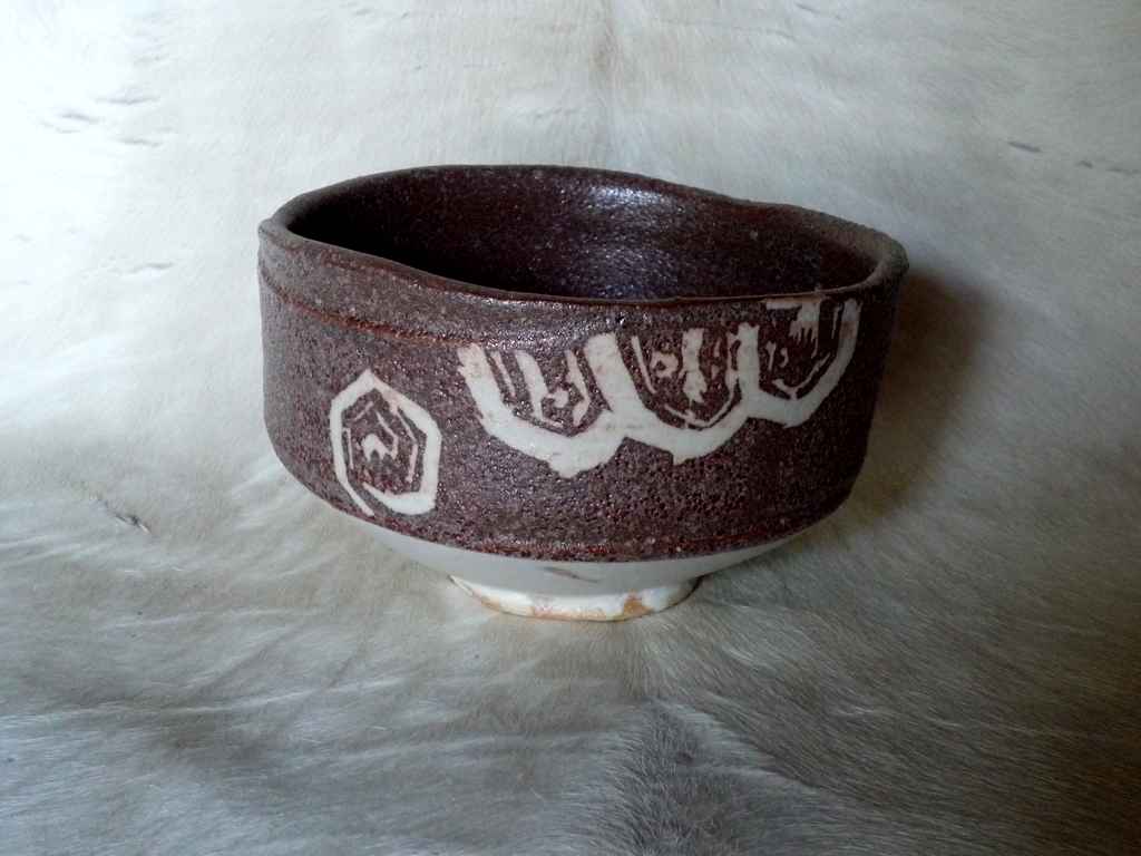 伝統的な模様をアレンジしたオリジナル模様を彫りました。寄居町の粘土を化粧掛けしてます。