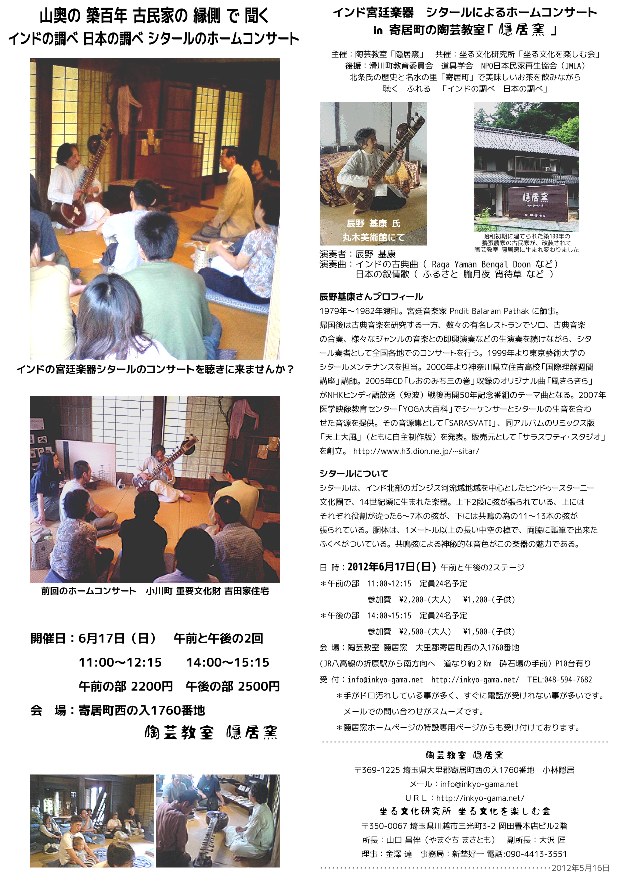 辰野基康シタールコンサートin隠居窯申し込みページ へ。